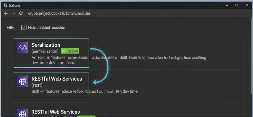 To develop a RESTful web service in Drupal 8 and above, the "RESTful Web Services" module, which comes pre-installed and awaits activation, should be installed. Before installing this module, make sure that the Serialization module is active.