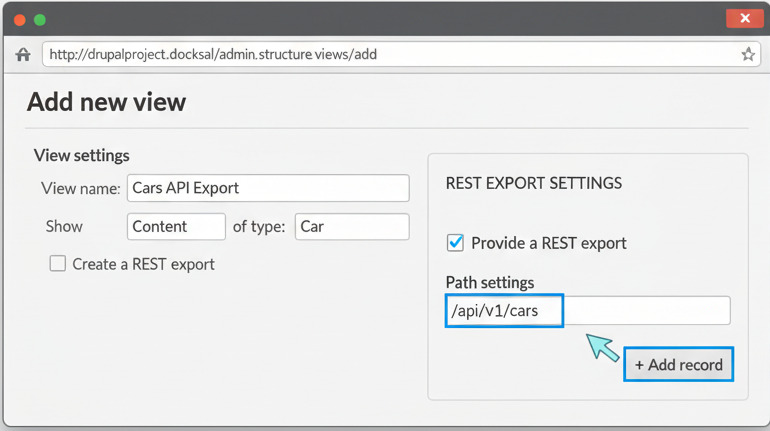 Afterwards, a new View should be created under the "Structure" tab, and the desired path should be specified by activating the feature under the "Rest Export Settings" tab, as shown in the image above. (/api/v1/cars).