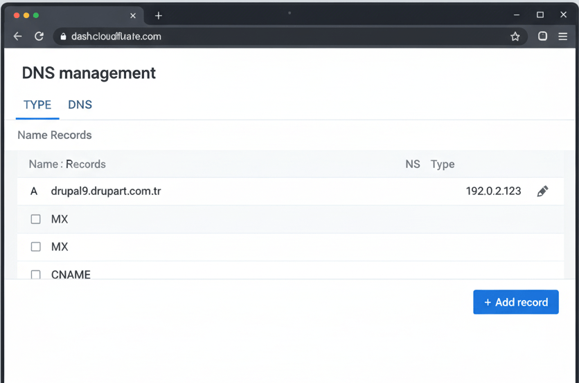Although Amazon provides free DNS services, Cloudflare is preferred for DNS management. In this example, using the DNS tab in the Cloudflare management panel, the static IP address has been associated with a subdomain of the domain you own. Now, you can access the website using the domain drupal9.drupart.com.tr. By following a similar approach, you can assign your own domain name to the IP address of your created server and access your Drupal site using the chosen domain name.